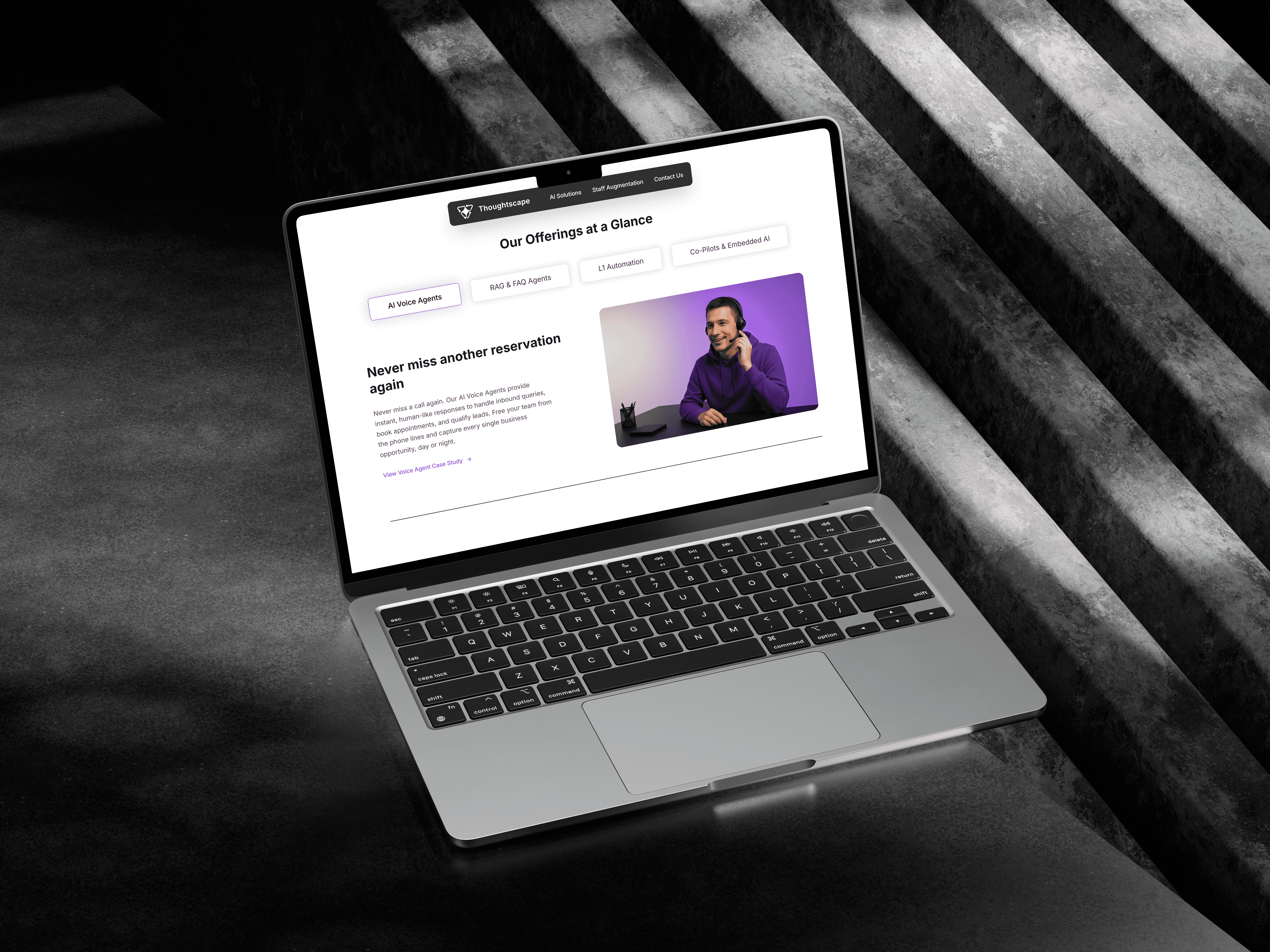 Developed complete brand identity and landing page for an AI solutions and staff augmentation company. Created a clean, professional visual system featuring sharp typography, sophisticated gradients, and modern color palette. The design communicates technical expertise and reliability while positioning Thoughtscape as a forward-thinking industry leader.